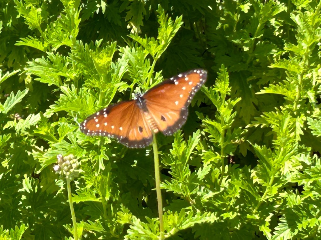 As I was writing this post, I spotted an adult Queen on the Gregg’s Mistflower (Conoclinium greggii) in the front pollinator garden, so I include it here for comparison. It always amazes me how different larval and adult colorations can be.