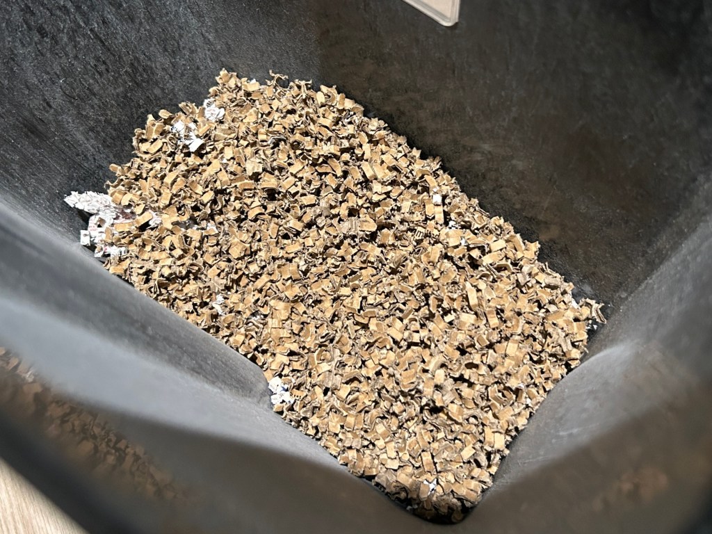 I knew that cardboard (not the shiny kind) could be included in compost but it was hard to cut or tear it into small pieces so that rarely happened. Then one day I received something that was packaged in thin, uncoated cardboard and I had the idea of running it through our little office shredder.