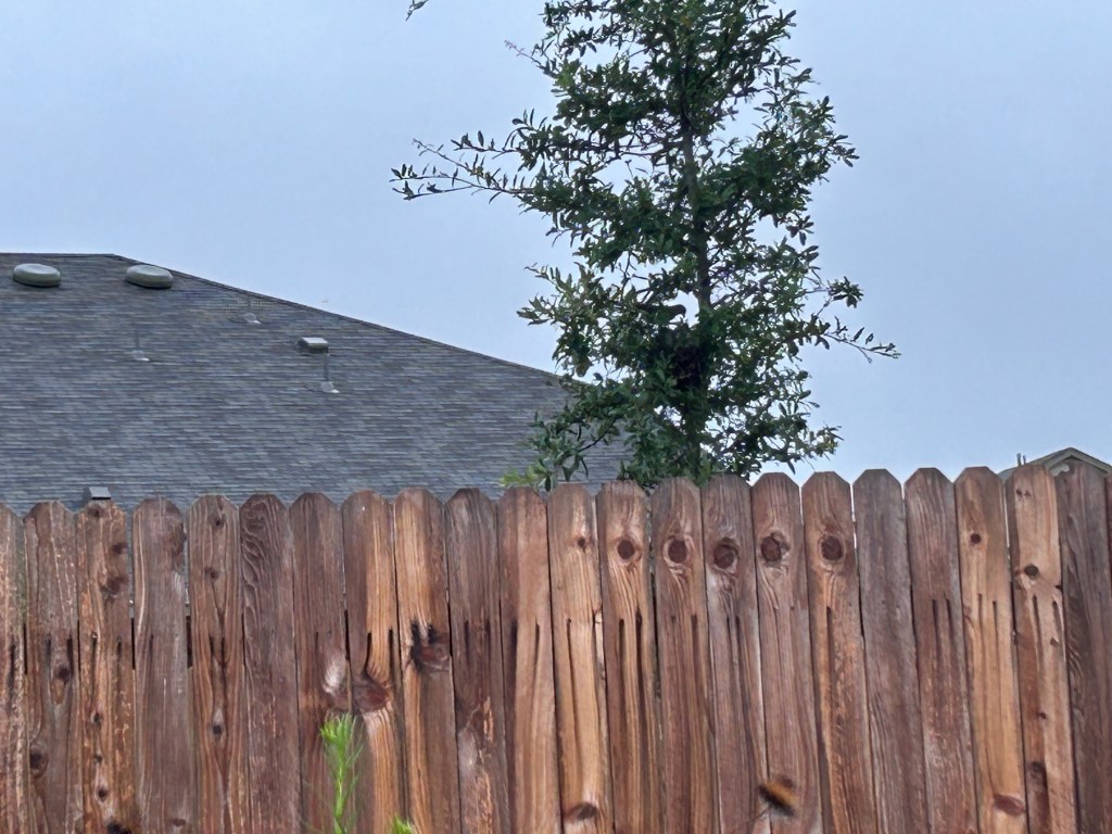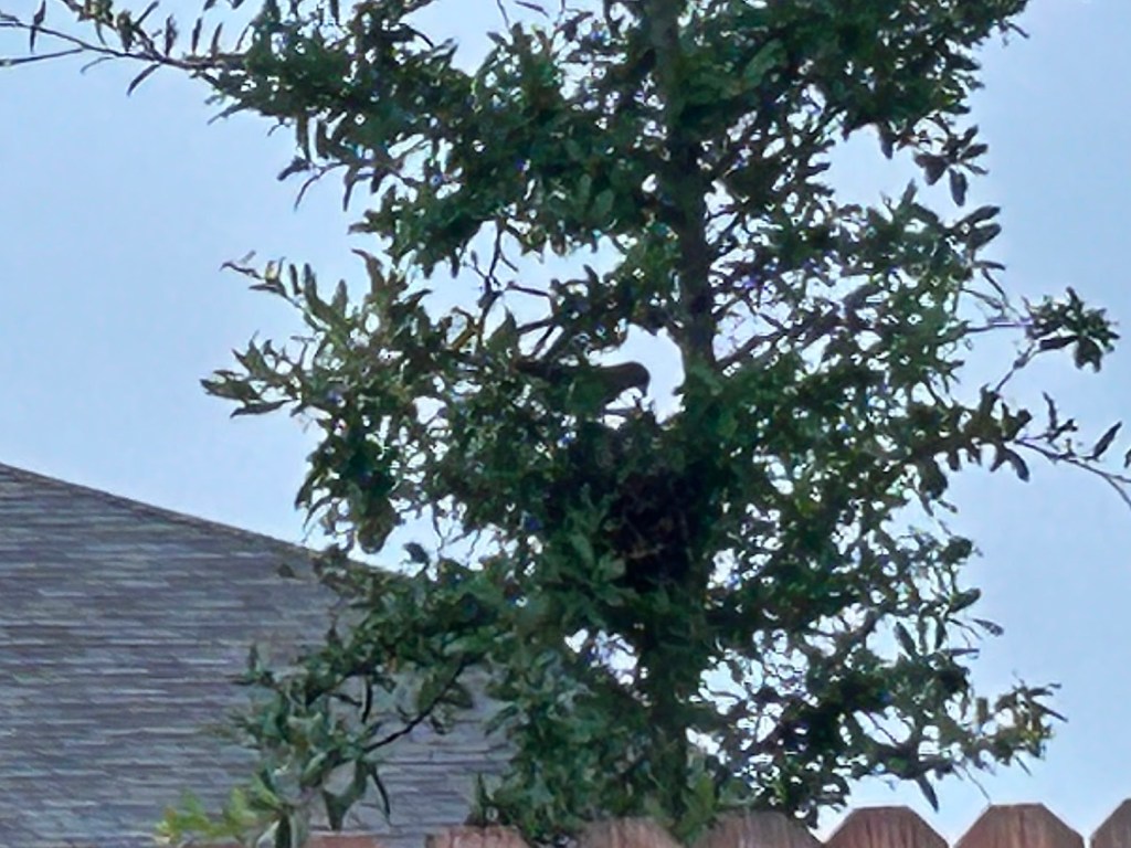 In a new housing development with no mature trees, there is not much opportunity here for birds to build nests yet. However, I’ve spotted one that is about half-way up a neighbor’s 12-foot oak tree. I can see the nest from our back patio.