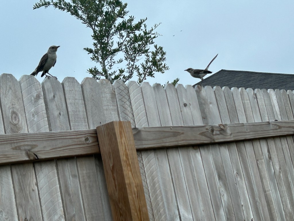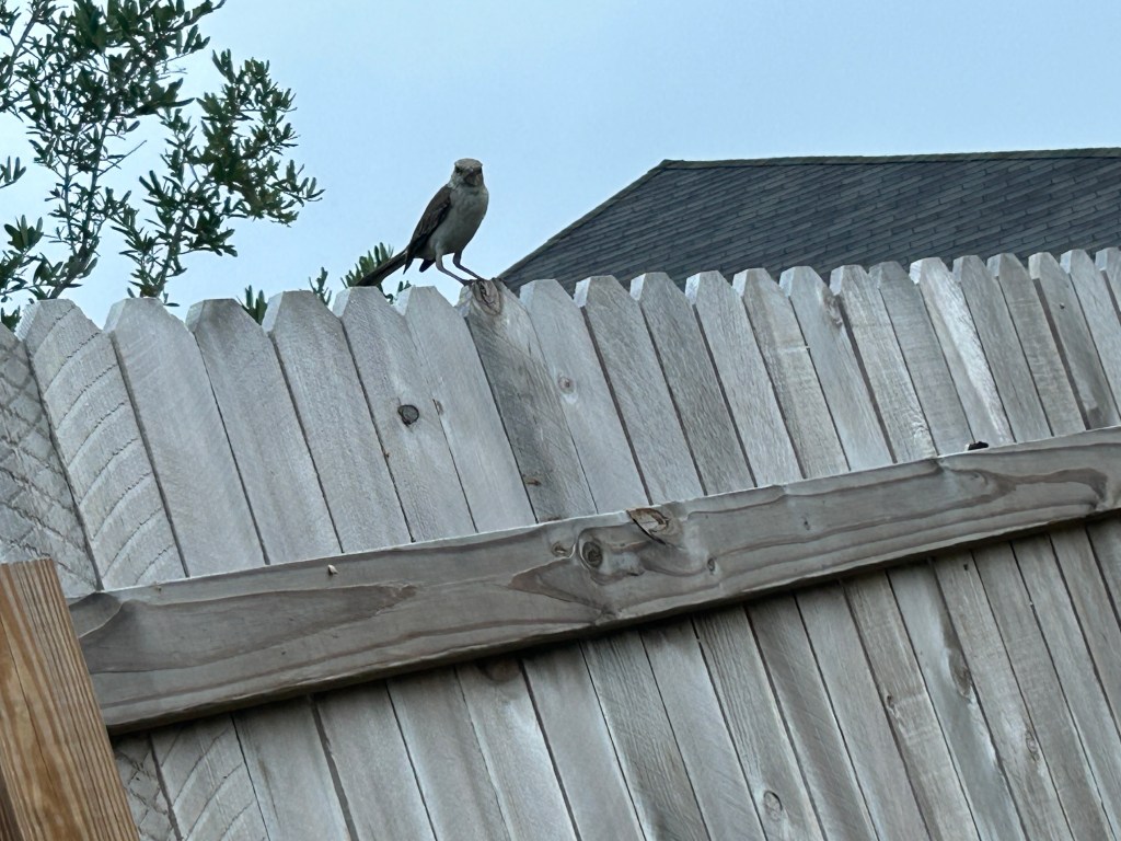 The beginning of this story was that a Northern Mockingbird (Mimus polyglottos) started to come often to our back patio, stand on the back of the chairs, and squawk towards the house. This, of course, was highly aggravating to our two indoor cats.
