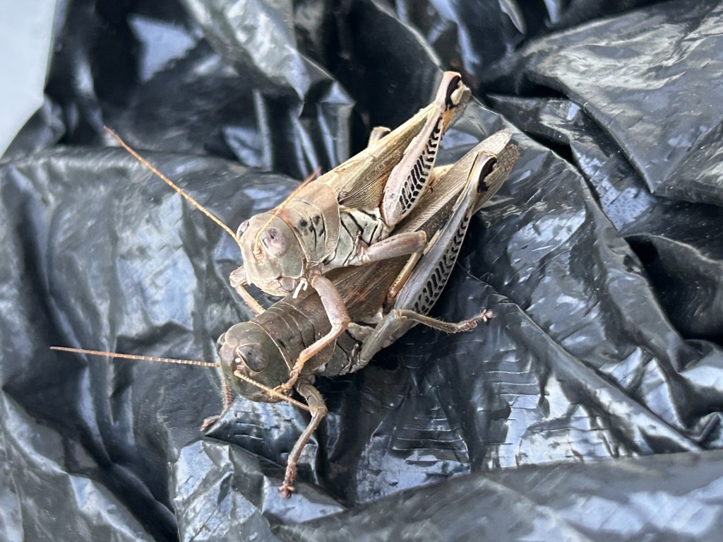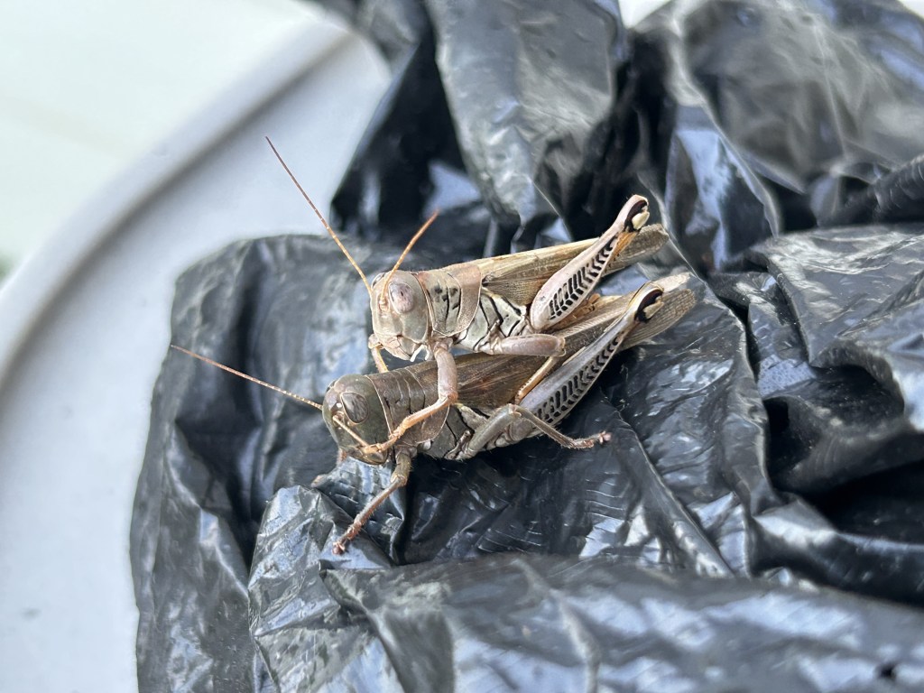 I lifted up a bag from the ground to put some garden waste in and found this pair of Differential Grasshoppers (Melanoplus differentialis) among the folds of plastic. I apologized as they hopped away (still connected!).