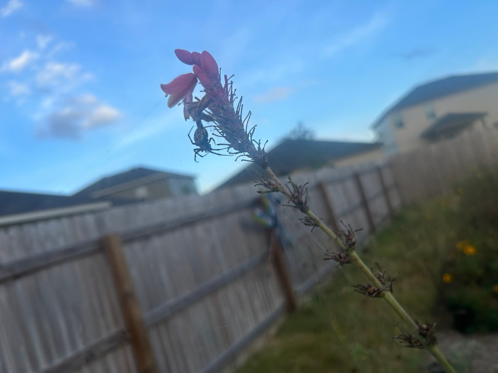 There is a Western Spotted Orbweaver (Neoscona oaxacensis) that has built an impressive web spanning from the Red Yucca flower spike to the fence that is eight feet away. I knocked the web loose one time by accident, but it was quickly rebuilt. So now I have learned to walk around it, although I suspect that I will eventually forget that it’s there. Or some other force will knock it down.