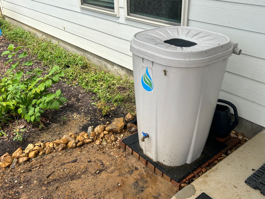 - There are two rain barrels behind the house to catch roof run-off. They hold only 55 gallons each, but except in times of extended drought they have been enough to fill watering cans or buckets. (One barrel is temporarily disconnected to make way for pond preparation work.)