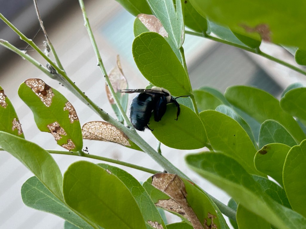 Here are a couple of Eastern Carpenter Bees (Xylocopa virginica) that I saw recently. One is on the spent flower head of a Mealy Blue Sage (Salvia farinacea) and the other is on a leaf of the Texas Mountain Laurel (Sophora secundiflora) tree. Mealy Blue Sage is very popular with many kinds of bee, and the Texas Mountain Laurel is nearby.