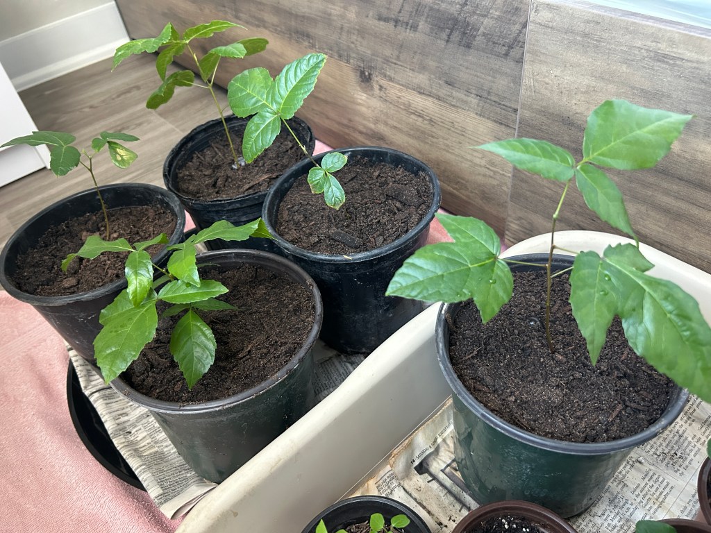 I was easily able to germinate seeds from a Mexican Buckeye (Ungnadia speciosa) tree a few weeks ago, and the five young seedlings have quickly grown in their 4-inch pots.