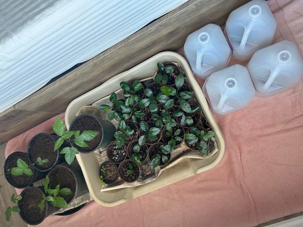 In mid-October, each of the five seedlings was given a 1-gallon pot with planting soil (because they will eventually go in the ground) and some Mycorrhizae to help boost root growth.