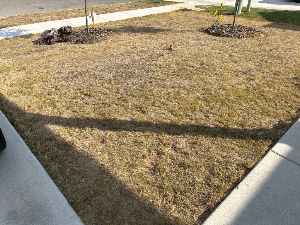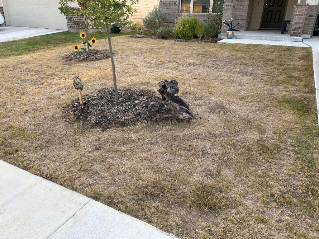 The Bermudagrass in the front lawn is rather brown because of heat and lack of water, but most of it is still alive and it will green back up once we get rain again. There are some bare patches but they don’t worry me. The Bermudagrass may grow back in, or other plants will fill in the spaces, either as volunteers or seeded by me.