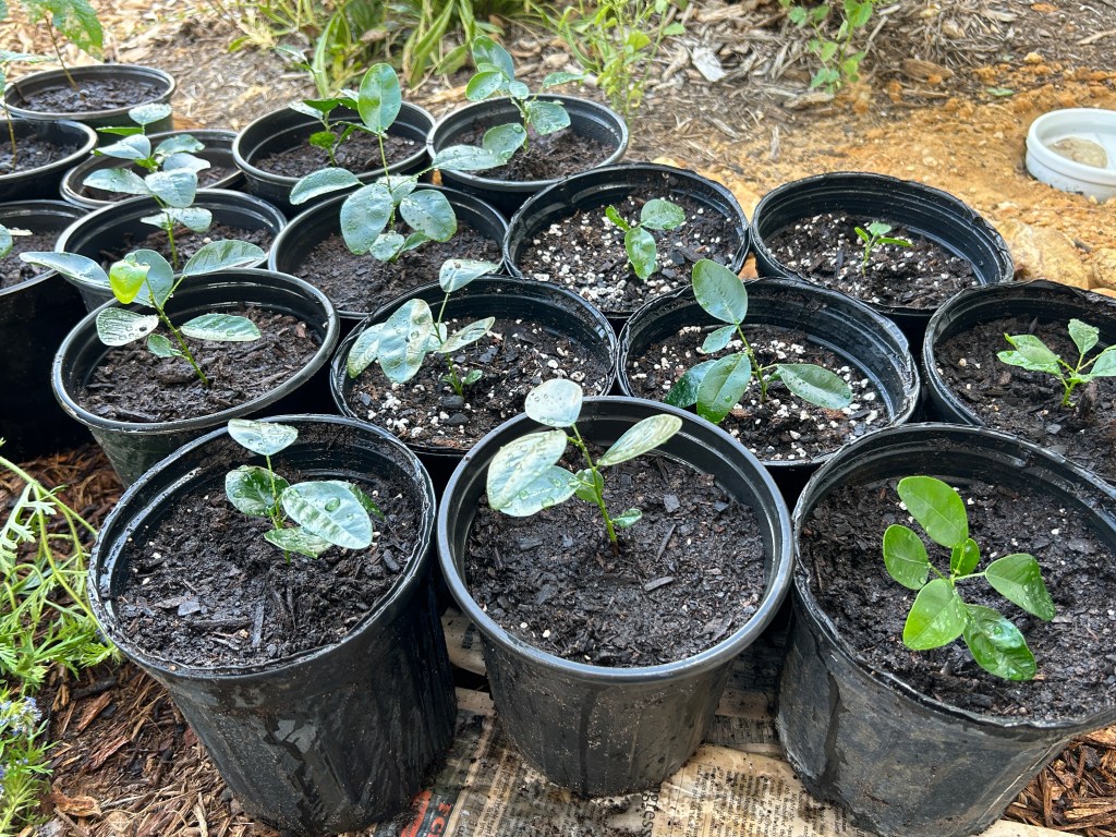 At the time of repotting I had 15 seedlings, all small but happy. They were moved into 1-gallon pots with planting mix and Mycorrhizae, and moved to an area near the patio where I have rigged up a little afternoon shade by attaching pillowcases to my newly installed trellis! The other pots there are Mexican Buckeye seedlings, and other things that are waiting to be planted in the garden.