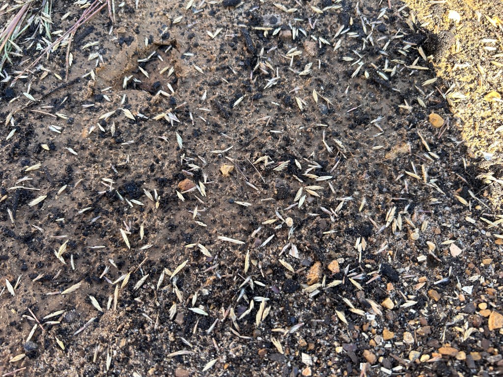 I realize that some of this seed will be lost to birds or ants, but grass seeds aren’t accustomed to being buried and I’m not going to use extra water to get them to germinate quickly.