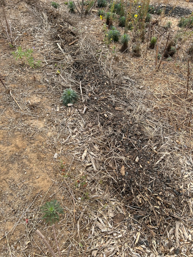 There is one strip, however, where I had laid pathway and formed “Three Sisters Garden” mounds on top of it. A year later, after that project had ended, the mounds were removed.
