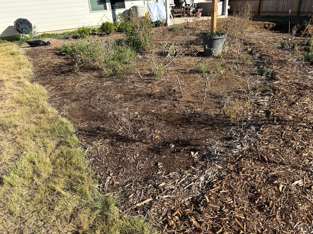 The second area where I added new seed was near the right-side fence where I previously was growing “Three Sisters” mounds. The mounds have been taken down and the mulch of the nearby pathway removed.