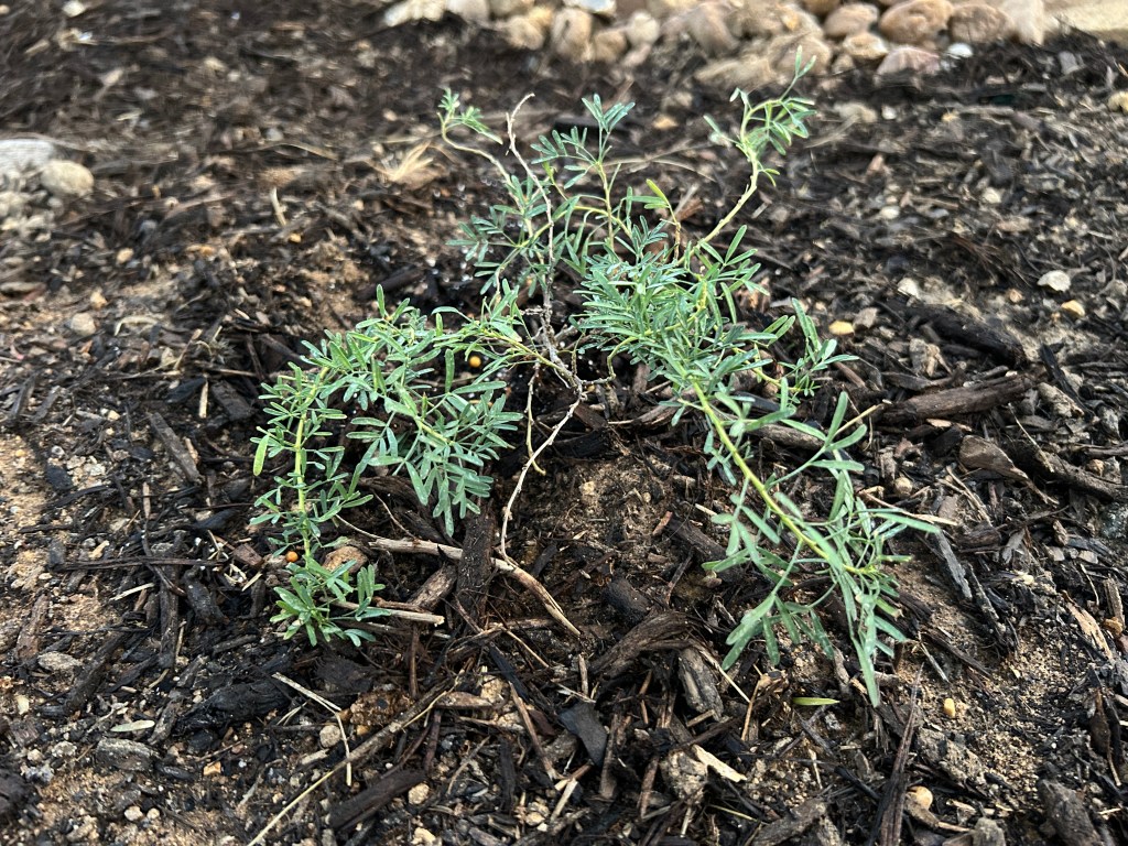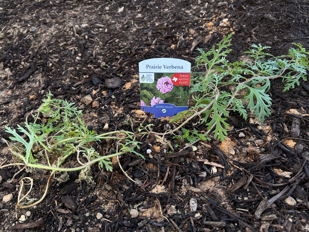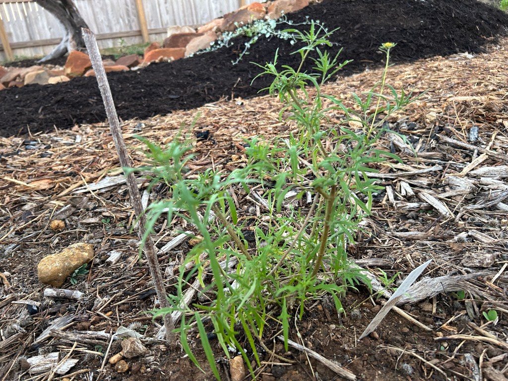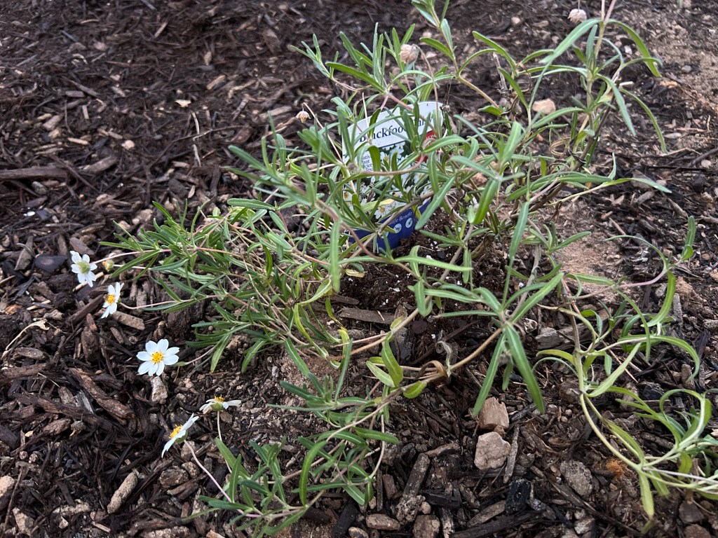 Blackfoot Daisy (Melampodium leucanthum) – in front of the pond – low, mounding plant with white & yellow flowers. This plant really does not like wet feet, so after the first day of planting I’m leaving this unwatered.