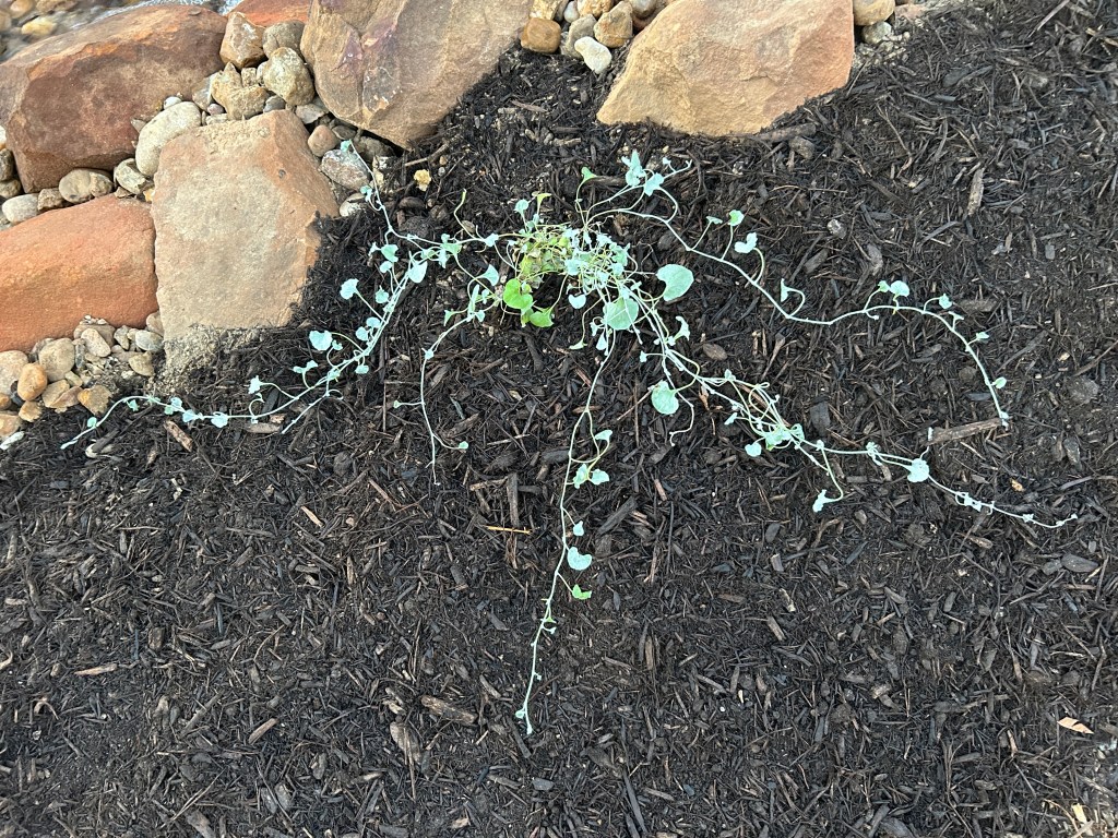 Silver Ponyfoot (Dichondra argentea) – clambering over the waterfall mound – silver gray leaves. This is a useful ground cover for erosion control and provides cover for small insects. I have this already draping out of the rain gauge pot, and in the front pollinator garden.