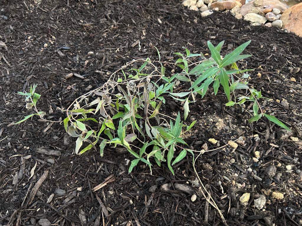 Prairie Verbena (Verbena bipinnatifida) – in front of the pond – short and sprawling with small purple flowers. This is a short-lived perennial, but it reseeds readily. I have one in the front pollinator garden as well.