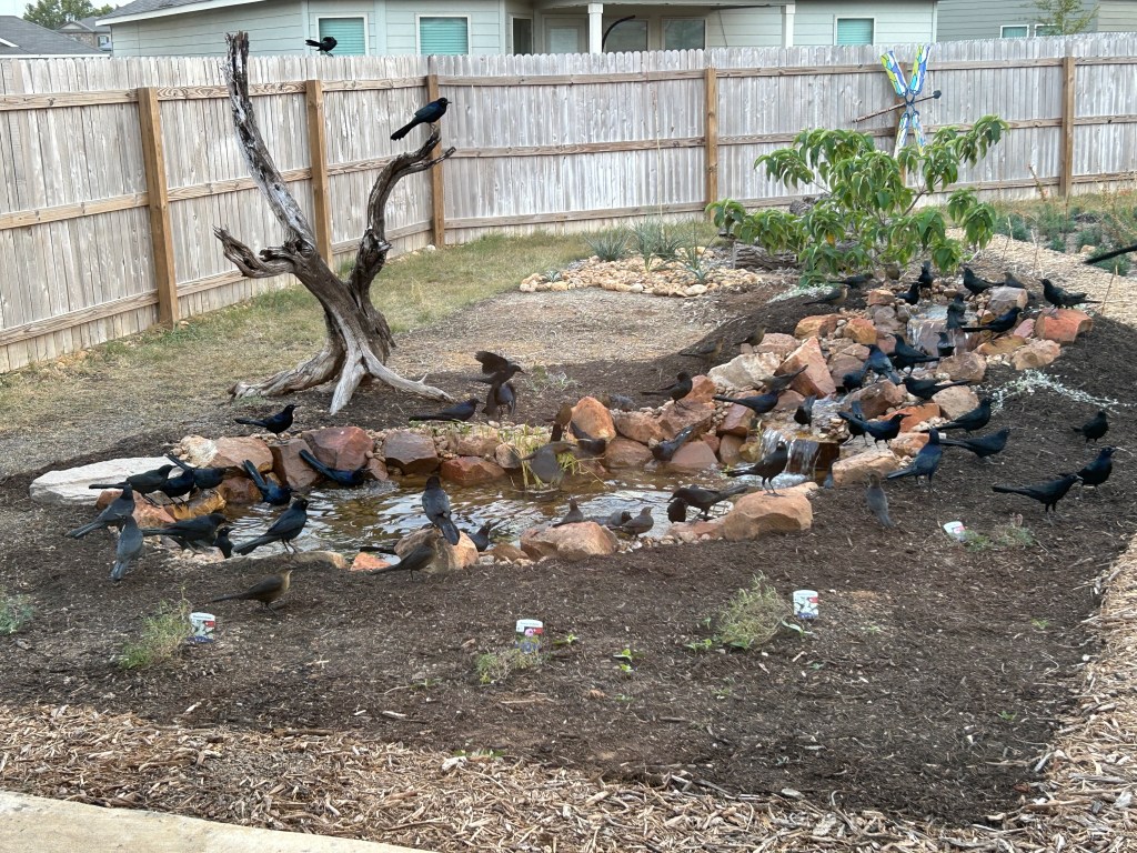 Then suddenly at dusk on Thanksgiving Day (November 28, 2024), there was a thundering on the roof that sounded like heavy rain and 50-100 grackles — a mixture of Common Grackles and Great-Tailed Grackles according to a knowledgeable friend — descended to the pond area. A short video is below.