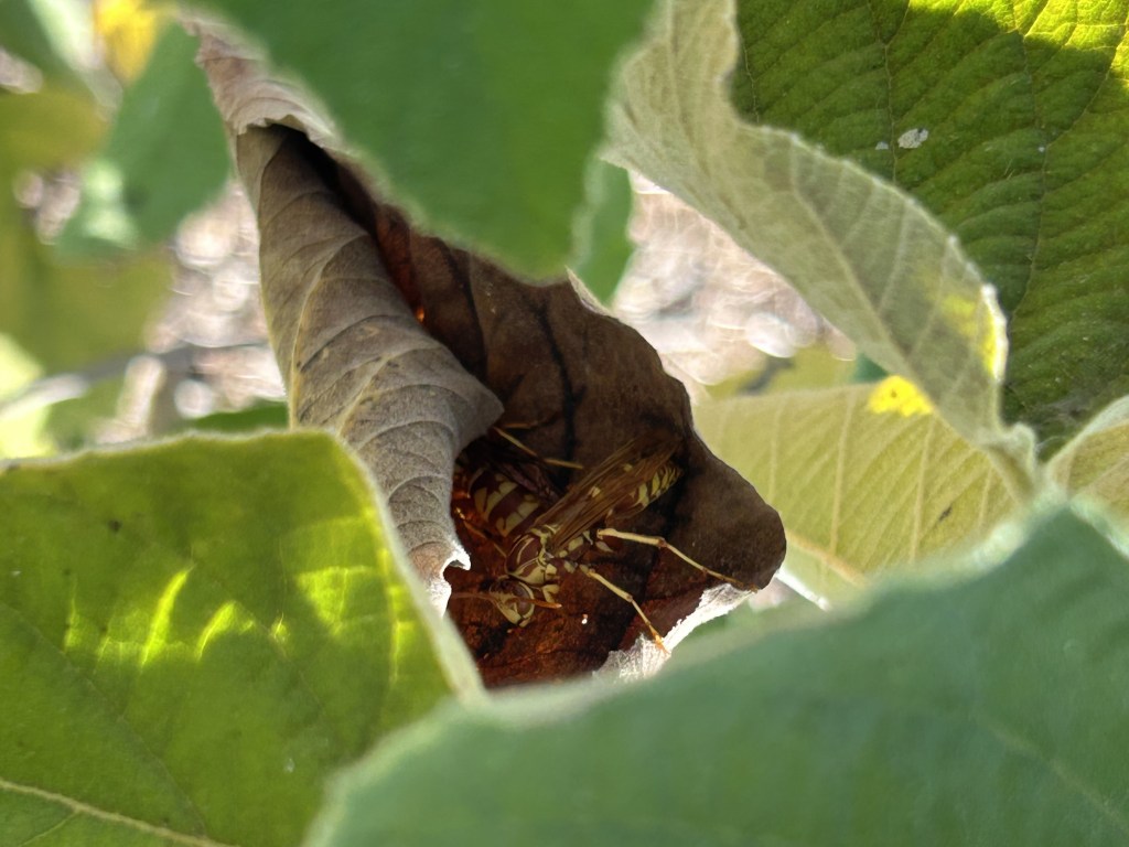 Towards the end of the Paper Wasp season in the fall, I would often see a few of them huddled together in leaves of the Mexican Olive tree, especially if the leaves had curled to provide more shelter.