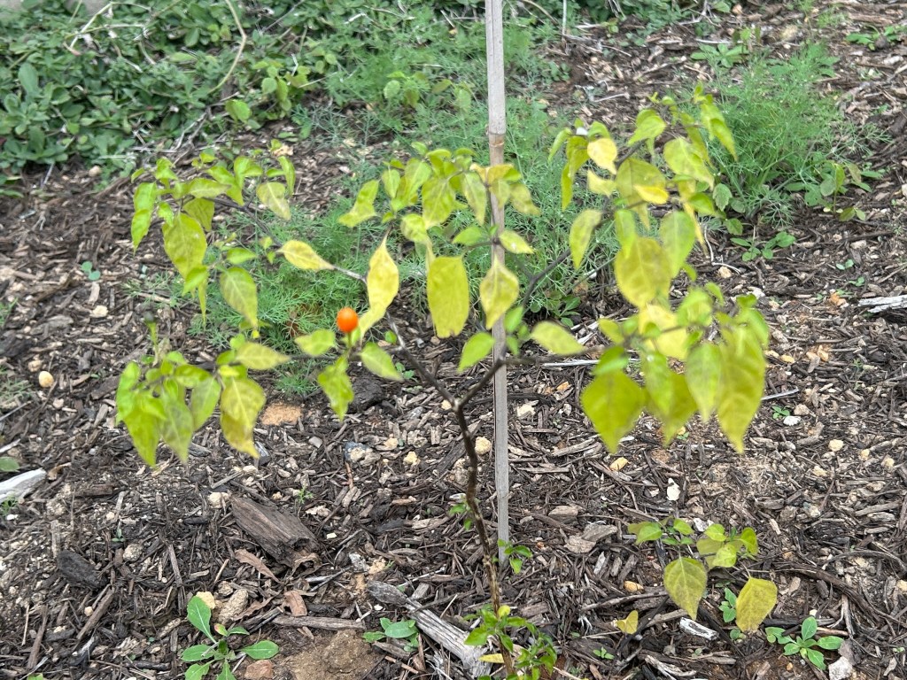 This is a replacement plant. The first one I planted didn’t survive so I’m trying again in a different location and with more experience myself now. With hindsight, I didn’t support the first plant enough during its first summer when we had a severe drought. This new plant has even grown a pepper in its first year.