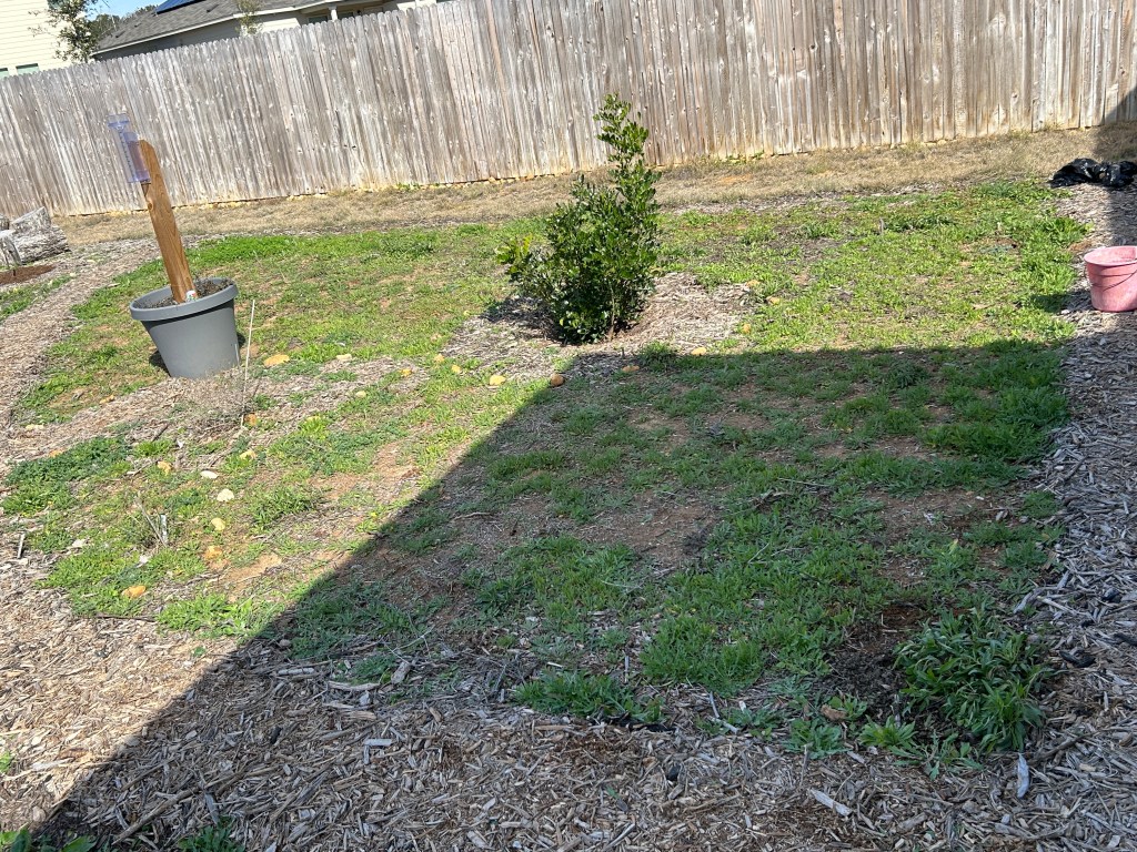 The first area I tackled is where there is a Texas Mountain Laurel tree, the rain gauge in a huge pot, a couple of shrubs (Flame Acanthus and Skeleton-Leaf Goldeneye), several Mealy Blue Sage plants, and a variety of annuals (last year those were primarily Bluebonnets, Firewheel aka Indian Blanket, and Sunflowers).