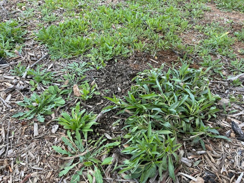 The Mealy Blue Sage (Salvia farinacea) plants here were mostly grown from seed that was spread in fall 2023. I didn’t think that anything had grown at first and then suddenly in July 2024 I noticed that there were actually about 20 new plants, which were particularly enjoyed by bees for the rest of the year.