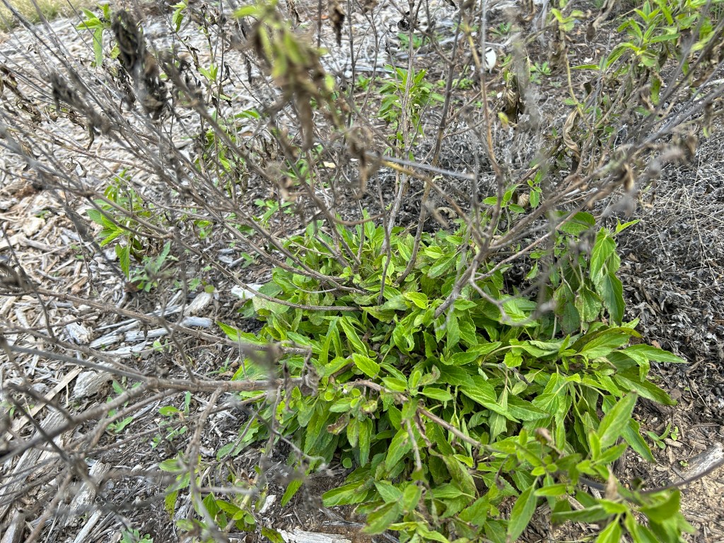 Mealy Blue Sage is a perennial plant. Like other salvias, older stems can get long and straggly, and it’s a good idea to cut them back a couple of times a year. Early spring is one of those times and the plant very helpfully makes it obvious which is the vigorous new growth close to the ground. So it’s an easy task to trim away last year’s growth. Below are “before” and “after” photos of one particular plant.