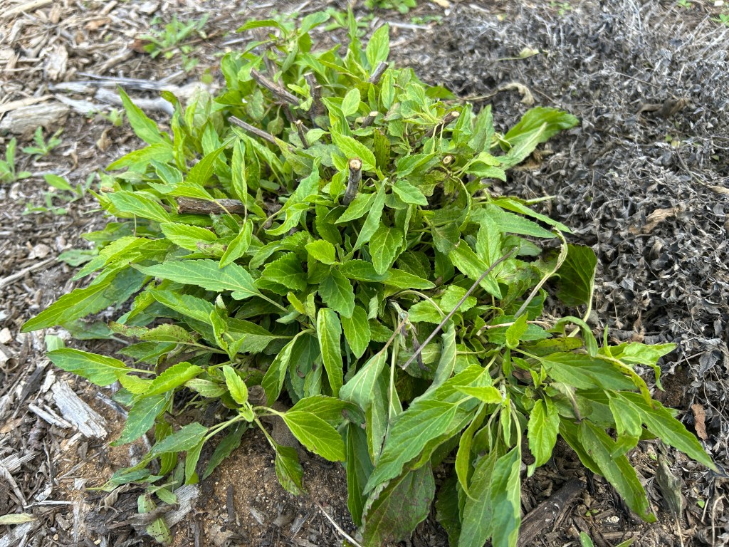 I don’t want to compost or shred the stems I cut immediately, in case there are still things sheltering on them. So for now they’re stored in a pile and I’ll process them in a few weeks.