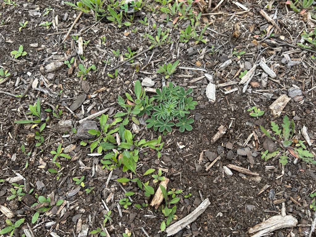 I will have a different approach for Bluebonnets (like the one in the center of the next photo), which fix nitrogen into the soil. As long as they are not in the way of anything else, I’ll let them grow through their full lifecycle before cutting them down. I want to give them the best opportunity possible to fertilize the soil.