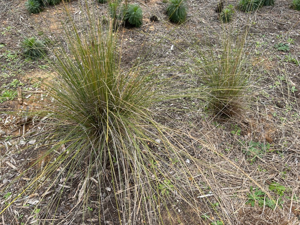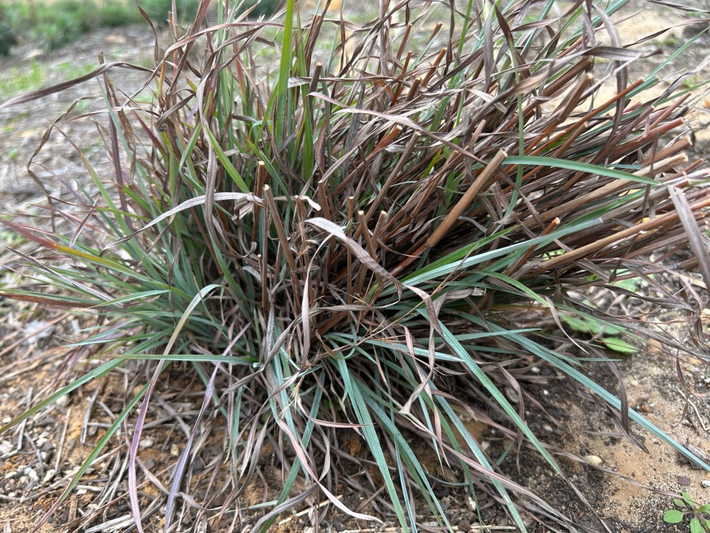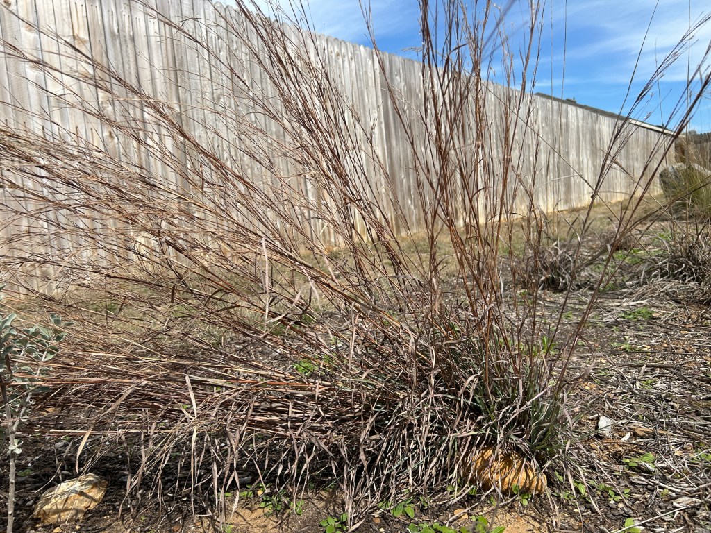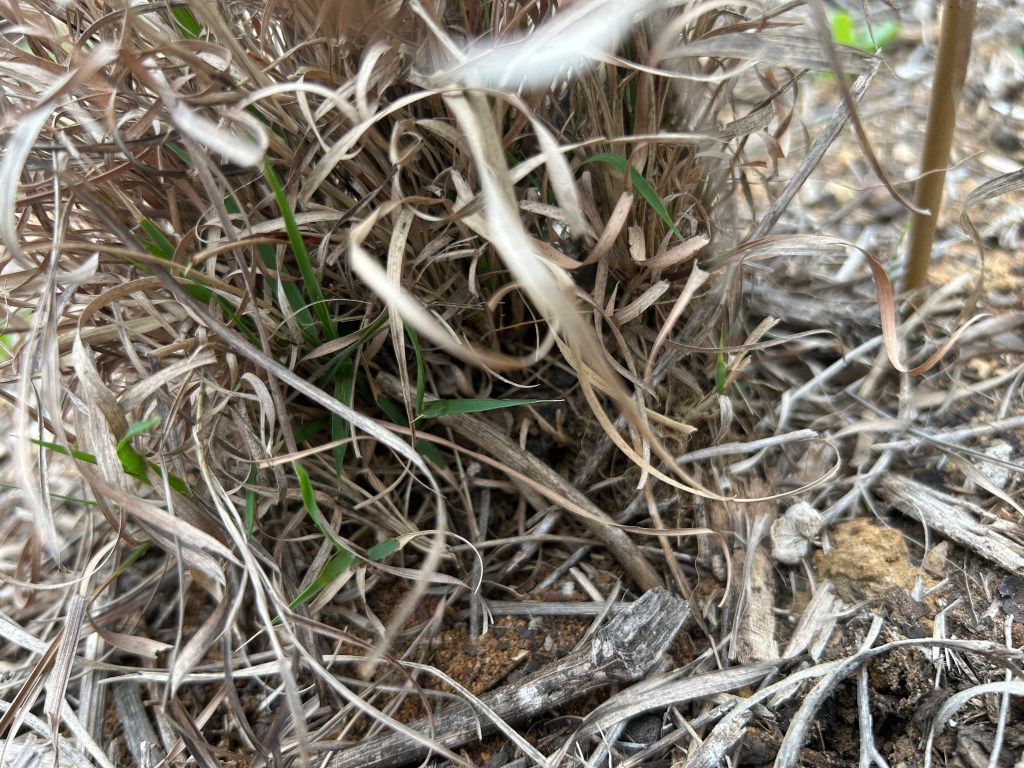 Indiangrass (Sorghastrum nutans). There are two clumps of this, which grew from seed harvested at Headwaters at the Comal (I am a volunteer there). There is new growth occurring at the edges of the clumps.