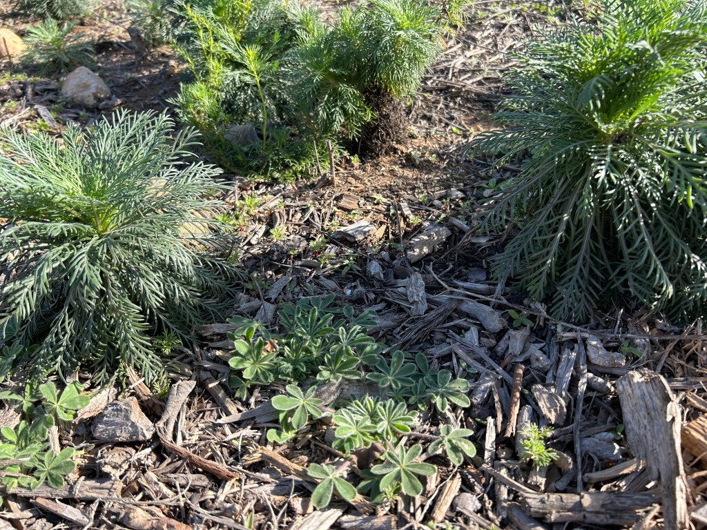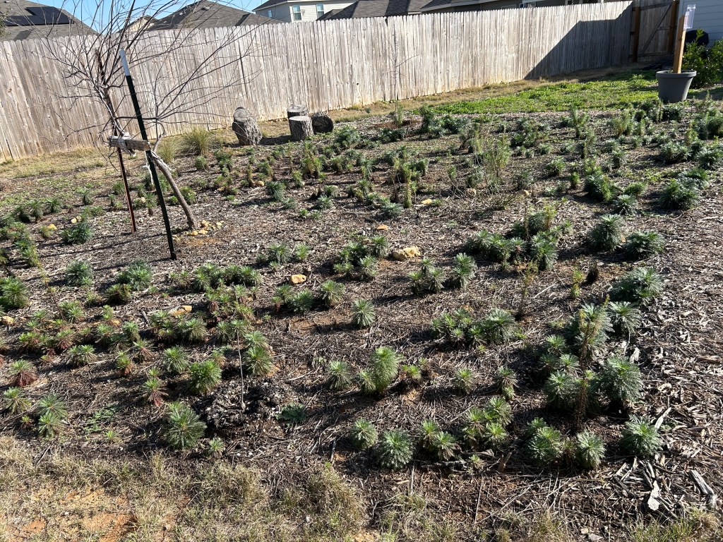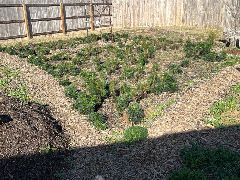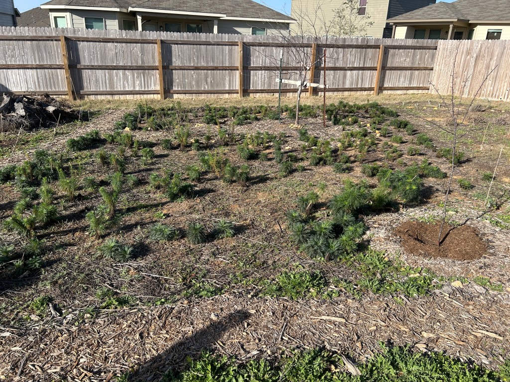 There is a defined area towards the back of the garden that includes three trees (Desert Willow, Mexican Plum, Red Buckeye), one shrub (Rock Rose), and the rest of the area is filled with taller annual or biennial plants (some seeded, some volunteer).