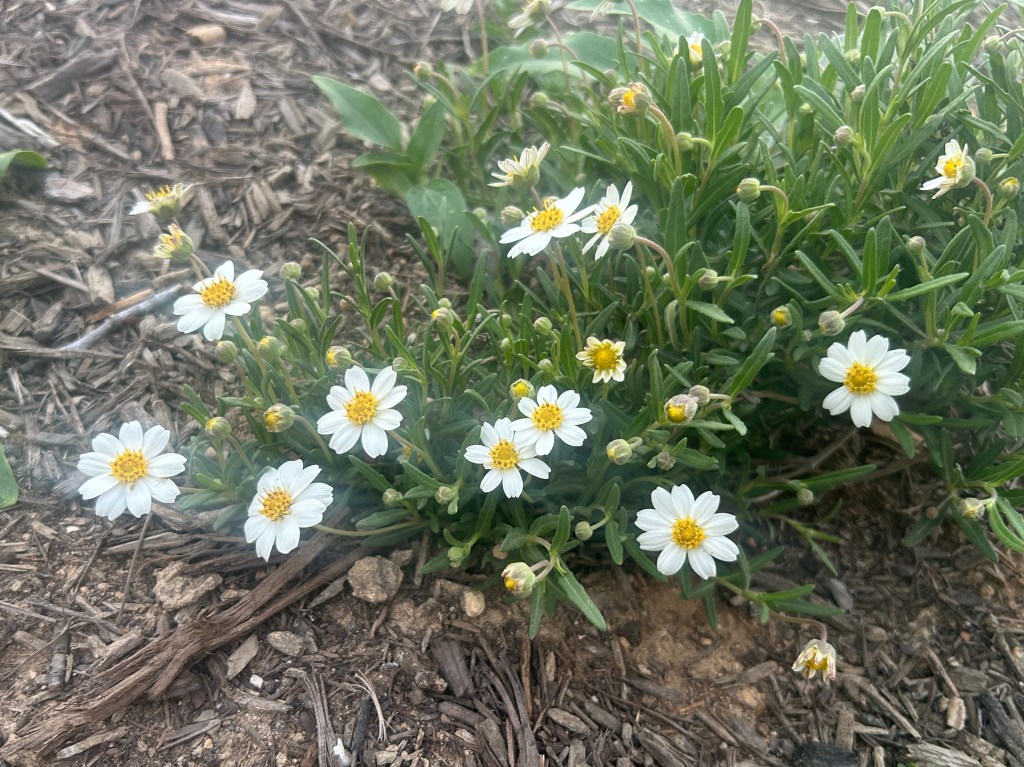 Blackfoot Daisy (Melampodium leucanthum). Both of the new plants are happy and blooming.