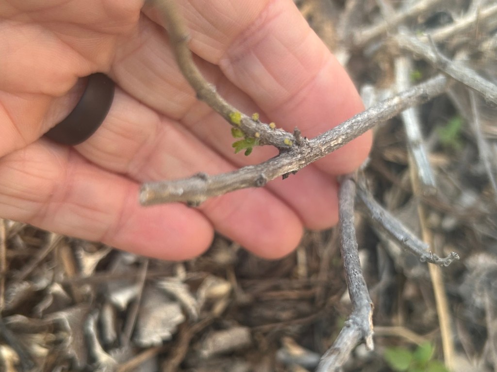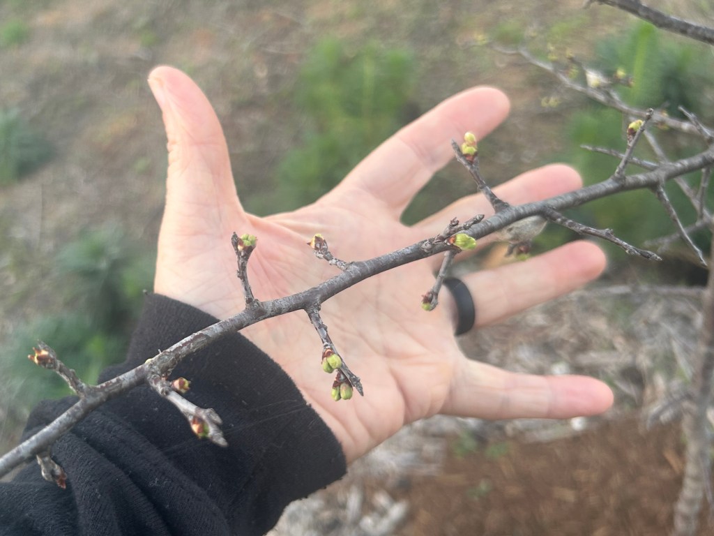 Mexican Plum (Prunus mexicana). This tree was chosen because it produces blooms very early in the year, even before its leaves. Last year it only managed to produce leaves, but this year it looks like there will be blooms for the first time.