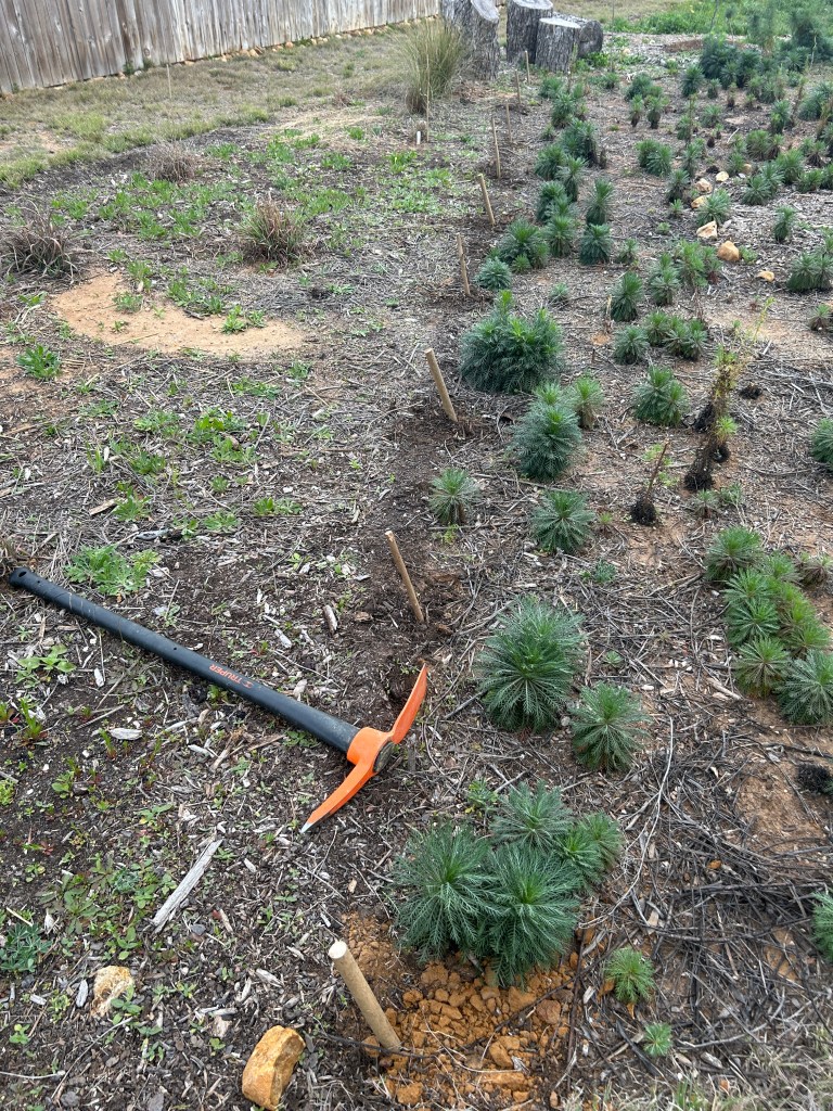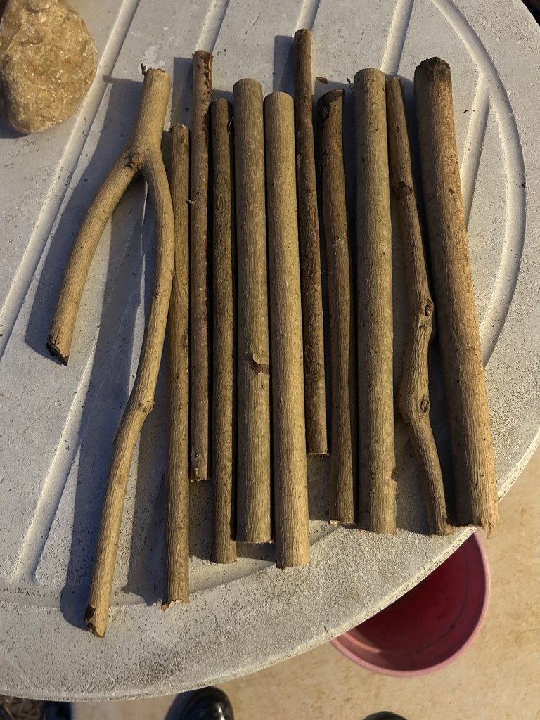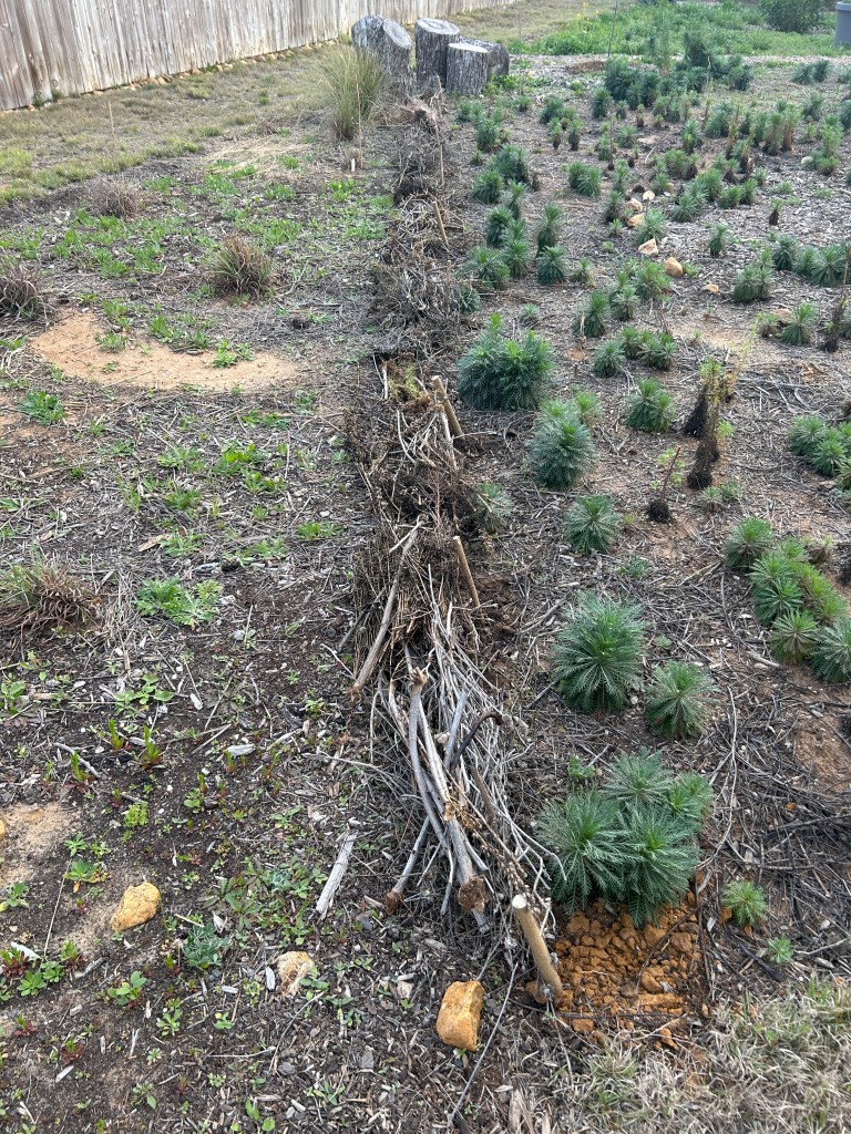 First I placed a row of stakes that were cut from invasive Ligustrum (Privet) trees that are being removed from Seguin’s Park West (I am on a volunteer forest restoration team there).