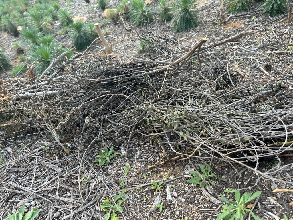 Against those stakes I stacked stems collected from annual plants after I had cut them down in the winter or spring.