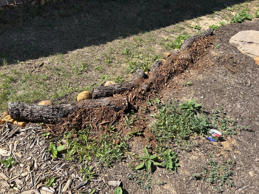On the “downhill” side of the pond, I have formed a berm with some logs and woodchip across a major pathway for water. The intent there is not to create a dam to block water, but if possible to slow down the flow to give the ground a better chance of absorbing it. Since I put those logs down (weeks ago), we have not yet had a heavy enough rain to observe what happens there.
