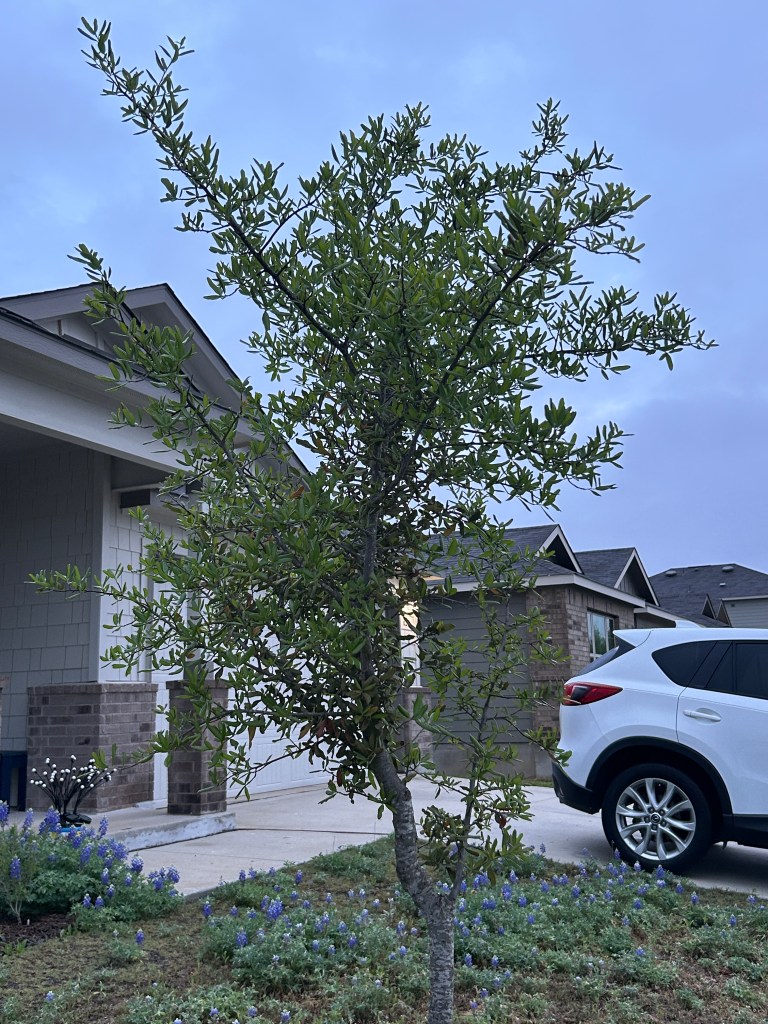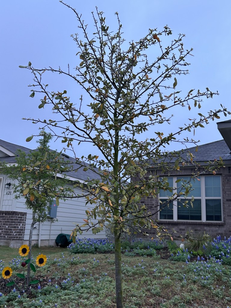 Live Oak (species unknown, planted by builder). There are two of these trees in front of the house. Live Oaks may appear to be evergreen. but they are in fact “tardily deciduous” in that they shed the previous year’s leaves in February or March as new leaves emerge. This year, as last year, the tree nearer the house is leafing out about two weeks ahead of the one nearer the street.