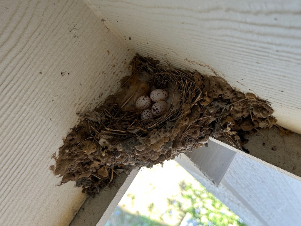 After several days of work building their nest, our Barn Swallow porch lodgers settled into a routine where the female was spending most of her time on the nest. So of course I was suspicious that there were eggs.
