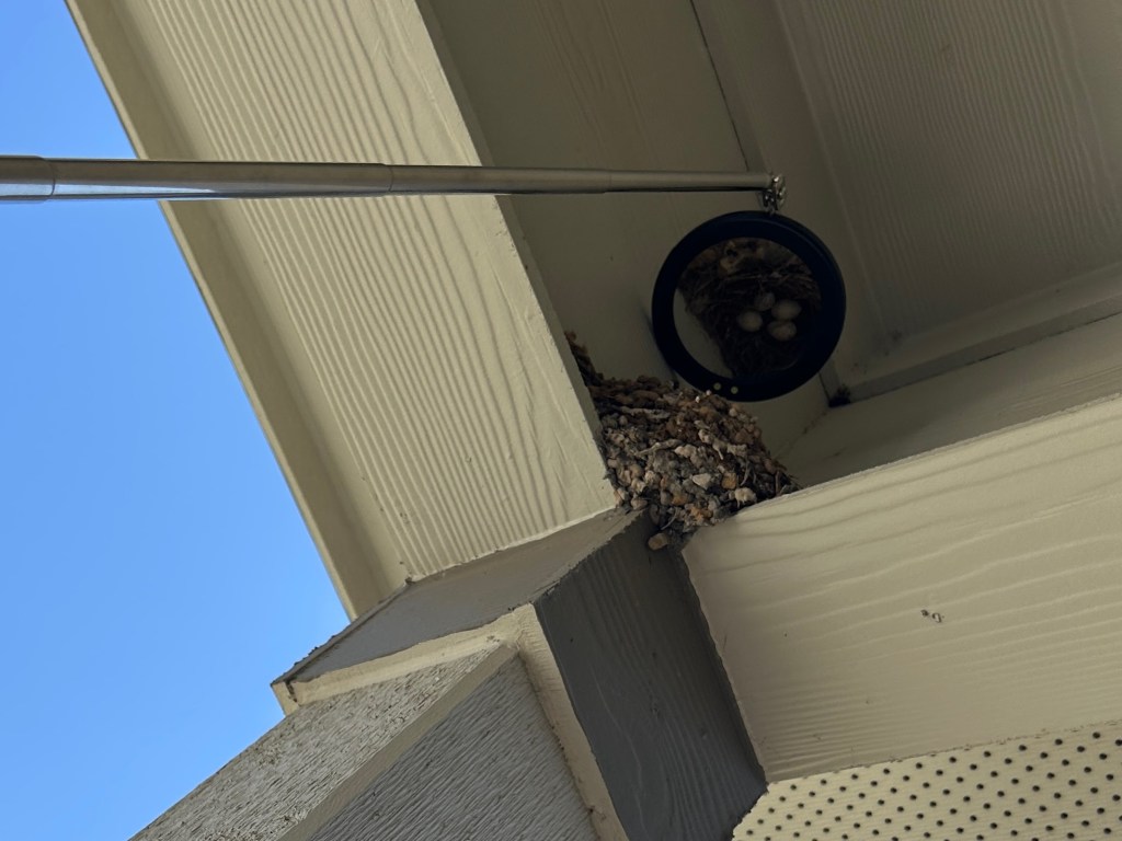 Being a curious person, I invested in a mirror on a telescoping handle in order to peer into the nest during times when the adults were away. Sure enough, there were four little eggs!