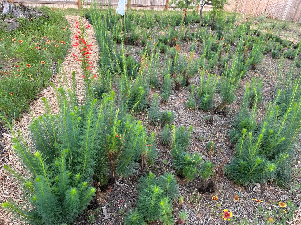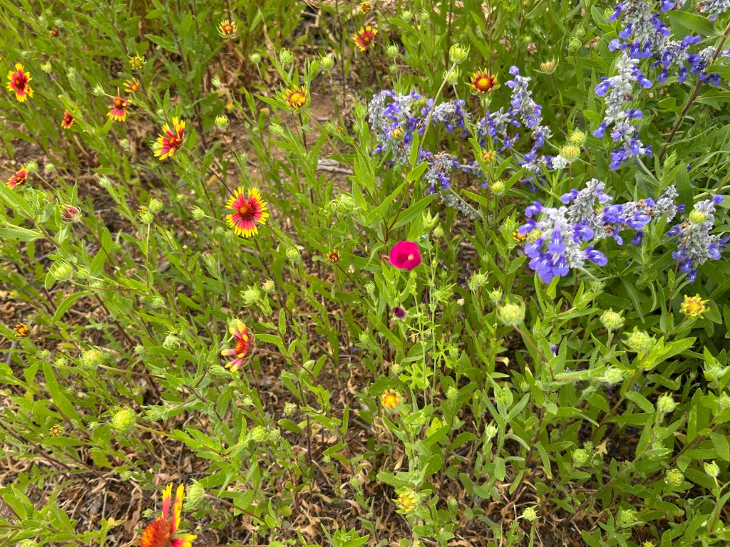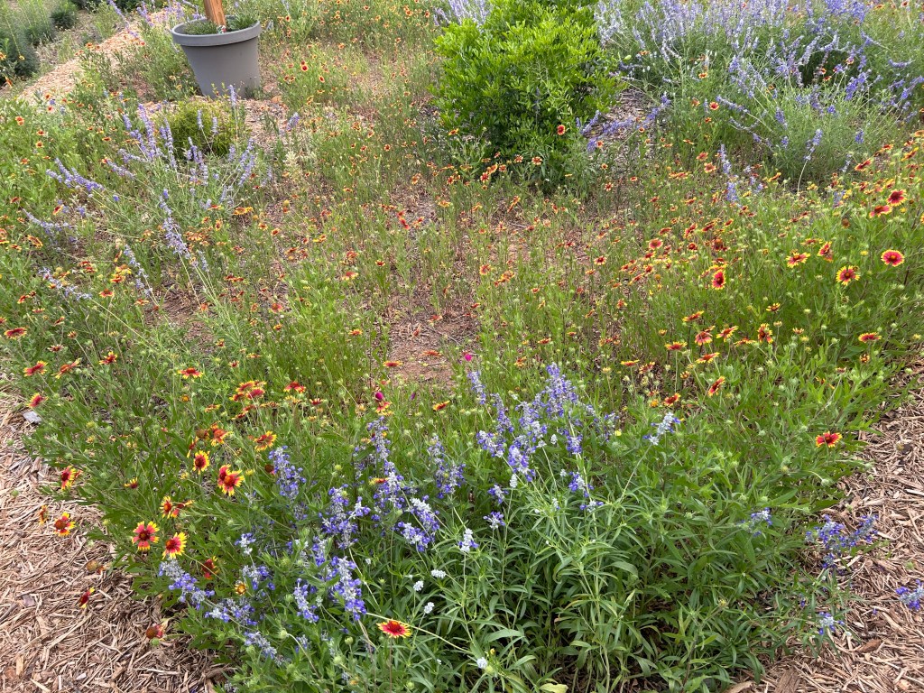Mealy Blue Sage (Salvia farinacea). There are a lot of these plants, grown from seed that I sowed in fall 2023. They surprised me by growing in later than I expected and this is their first spring for them to be mixed in with the Firewheels — I like the contrast of colors. They are the blue plants in the foreground here.