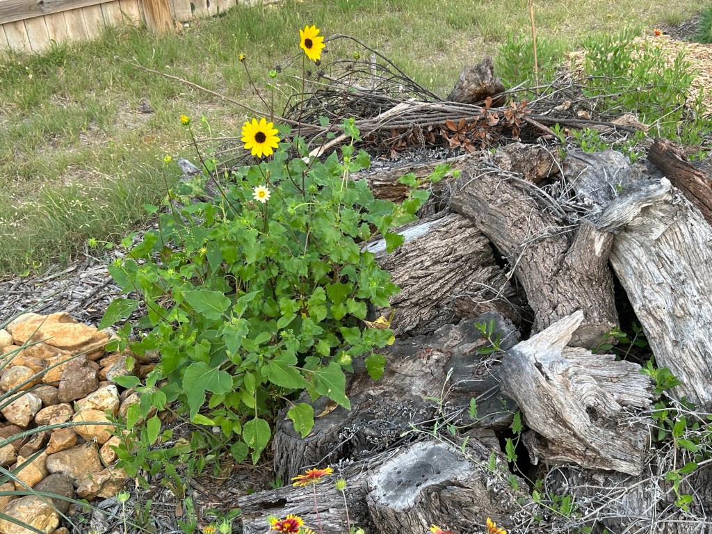 Common Sunflower (Helianthus annuus) and Beach Sunflower (Helianthus debilis). Sunflowers have been cheerful volunteers in this garden from the very beginning. This year I am being more selective in where I allow them to grow, but behind the pond and near the wood pile are two of those places.