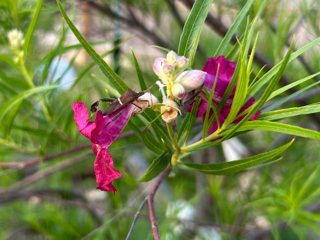 Desert Willow (Chilopsis linearis). The first blooms on this tree are now here, which makes the hummingbirds happy. In this photo there is also an Eastern Leaf-Footed Bug (Leptoglossus phyllopus).