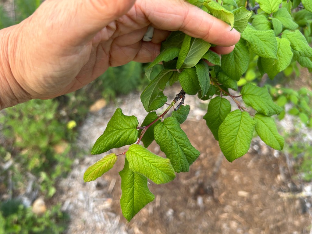 Mexican Plum (Prunus mexicana). This tree produces blooms early in the year, and then proceeds to grow new leaves and to extend its branches. In this photo you might be able to see the end of the “old wood” near my fingers and then a few more inches of new wood (the narrower, redder stem) that has grown very quickly in the past few weeks.