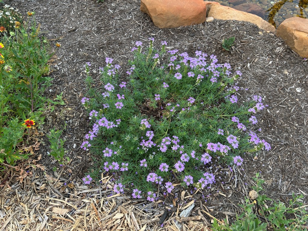 Prairie Verbena (Verbena bipinnatifida). I planted three of these near the pond in November. Only one was strong enough to survive the winter freezes that occurred just a few weeks later, and it’s doing very well. It is already many times its original size.