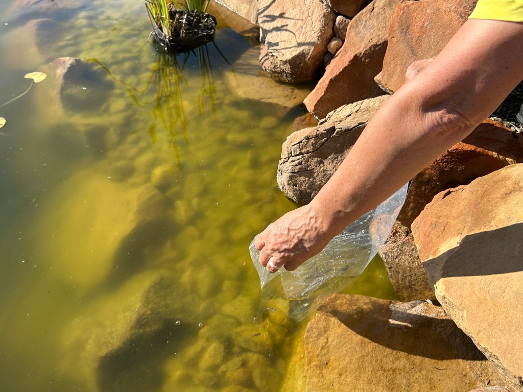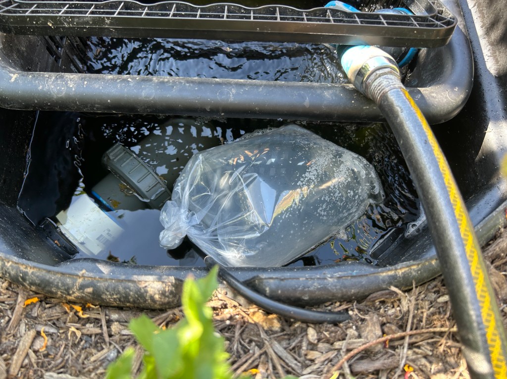 To introduce the new fish to my pond, first I floated their bag in the water for about 30 minutes to equilibrate for temperature. I did that in the small area where the pump is located so that I could easily retrieve the bag again. (I was topping up the water level at the time, hence the hosepipe.)