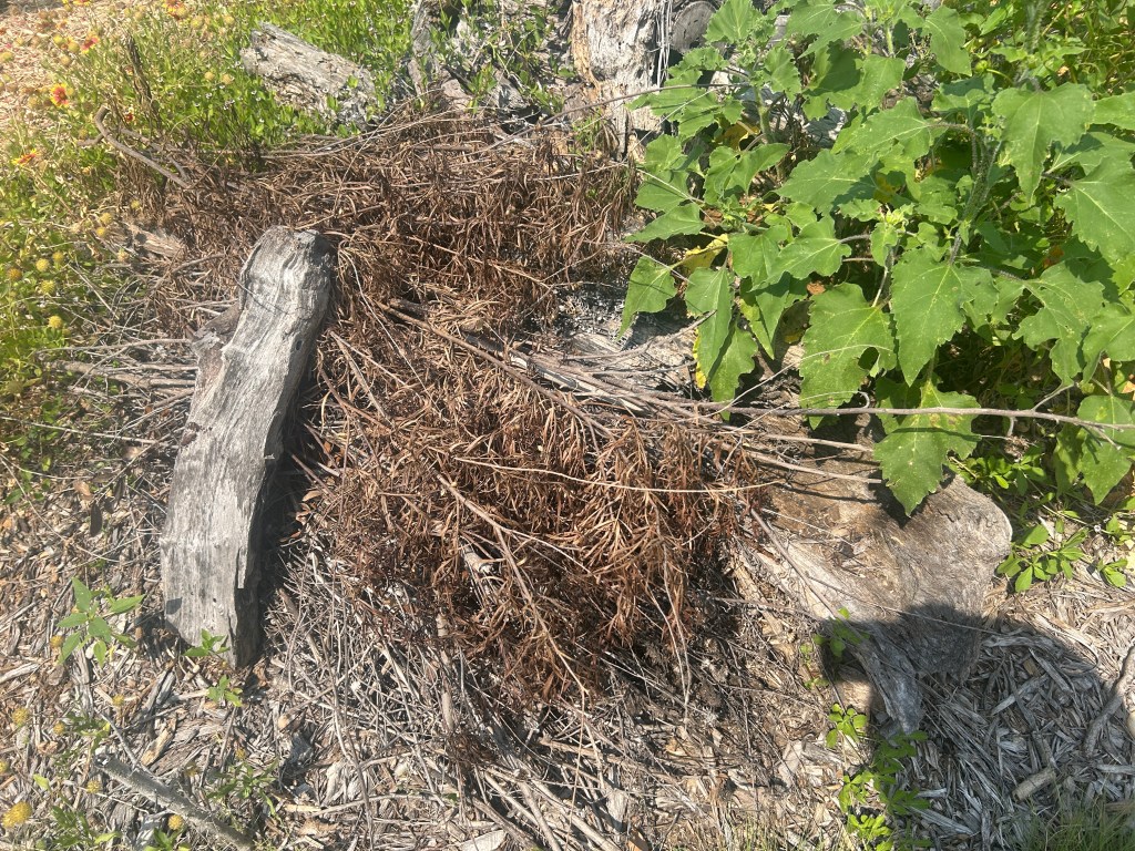 If I am shredding annual plants, then there is a high likelihood that the product will contain seeds. Ideally then, the shredded pieces should go where I don’t mind those seeds germinating. For instance, I thought last year if I put shredded Firewheels in the prairie grass area, then the weeding would be minimal. Instead, hundreds of flowers emerged and since I want to keep forbs out of the grass area, then I have spent a lot of time pulling them up before they go to seed. Lesson learned!