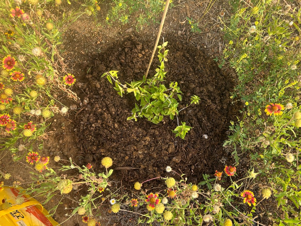 And then the dirty buckets were rinsed out and the resulting “tea” was poured on the Mexican Olive tree, which is still growing back after its severe winter freeze. Only the lowest branch and a few inches of trunk survived. (I’ve left the upper branches in place for now, because birds like to perch on them.)