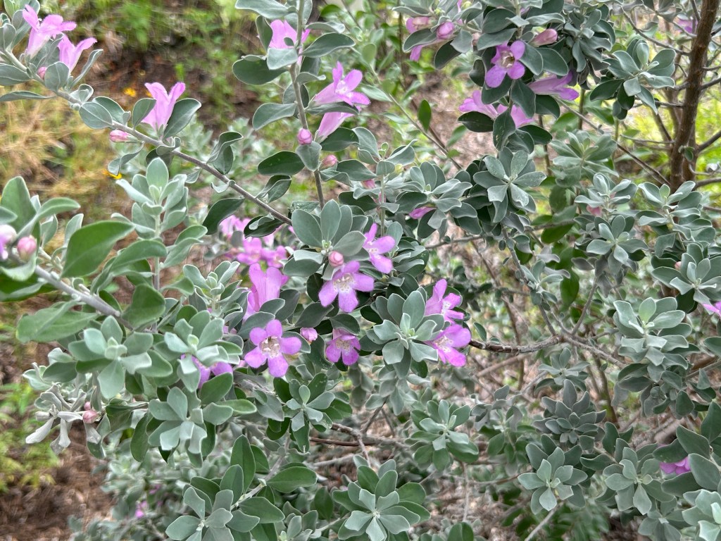 Cenizo aka Texas Sage (Leucophyllum frutescens) is “supposed” to bloom after a rain, but mine doesn’t always do that. After six inches of rain, it did!
