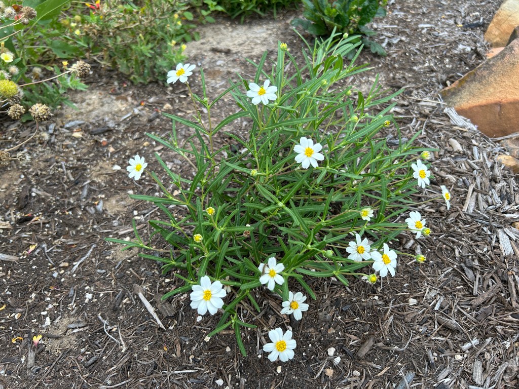Nearby is one of the newest Blackfoot Daisies (Melampodium leucanthum) that just a month ago was a scrawny seedling.