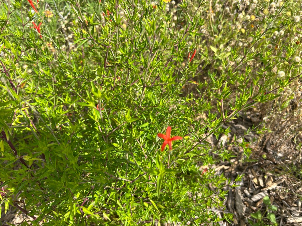 Flame Acanthus (Anisacanthus quadrifidus var. wrightii) is in its second year here and this shrub near the rain gauge is the biggest of the three that I have. It’s the first to bloom this year.