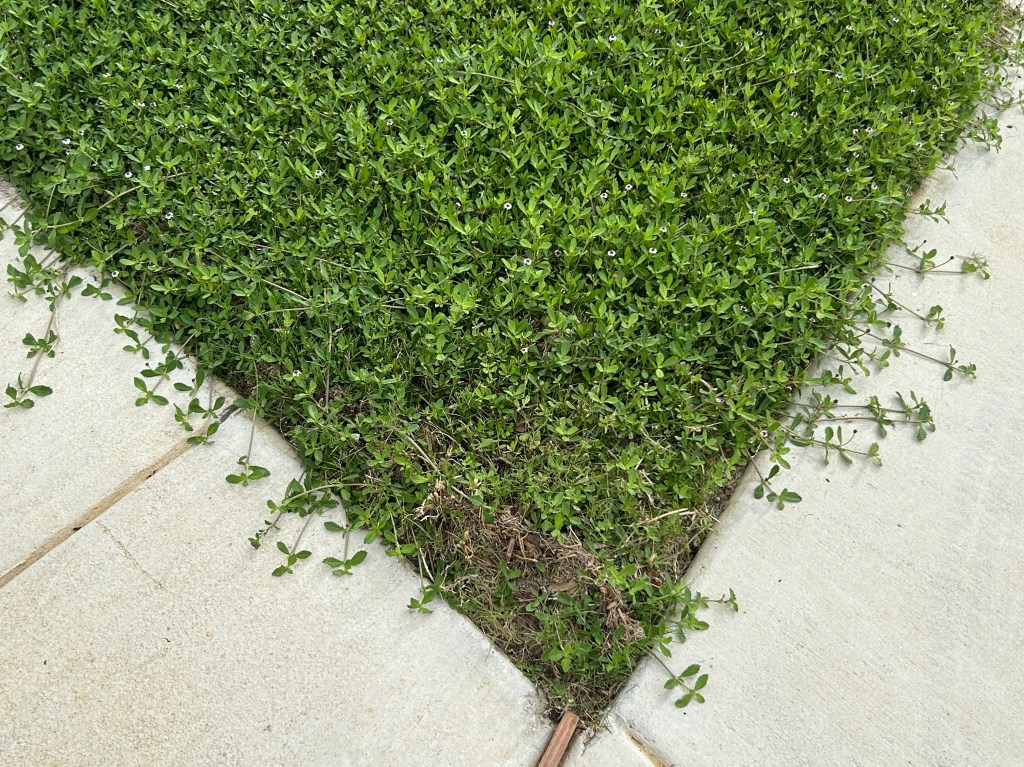 Frogfruit (Phyla nodiflora) is a fast grower. I mowed and trimmed it just before I left and this is what I came back to.