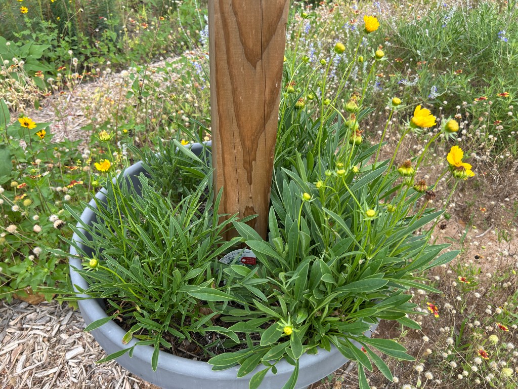 Lanceleaf Coreopsis (Coreopsis lanceolata) grows in the giant pot that holds the rain gauge. These are already more blooms than I had last year.