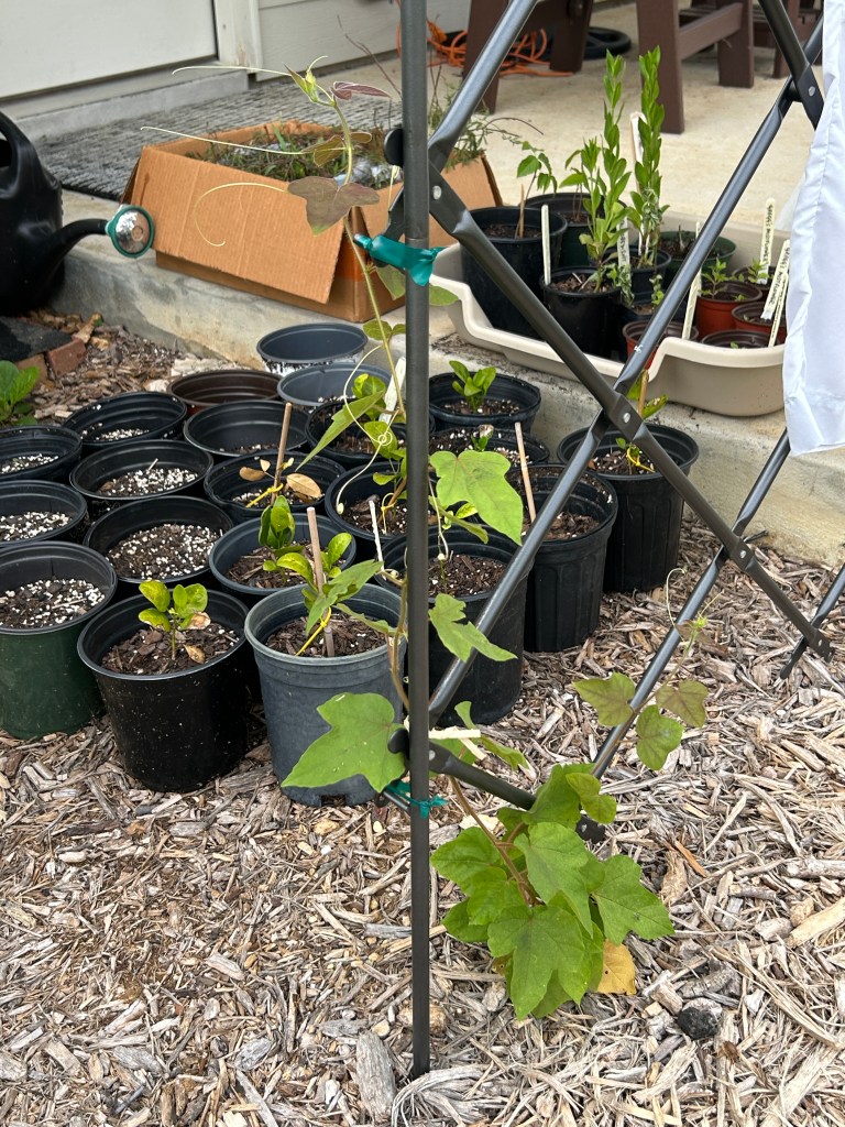 Scarletfruit Passionflower (Passiflora lanuginosa) doubled in height in the few days I was away. This has only been in the ground a few months and it’s already reached several inches above the green tape in this photo.